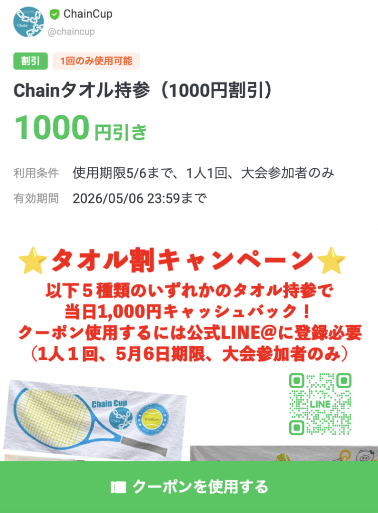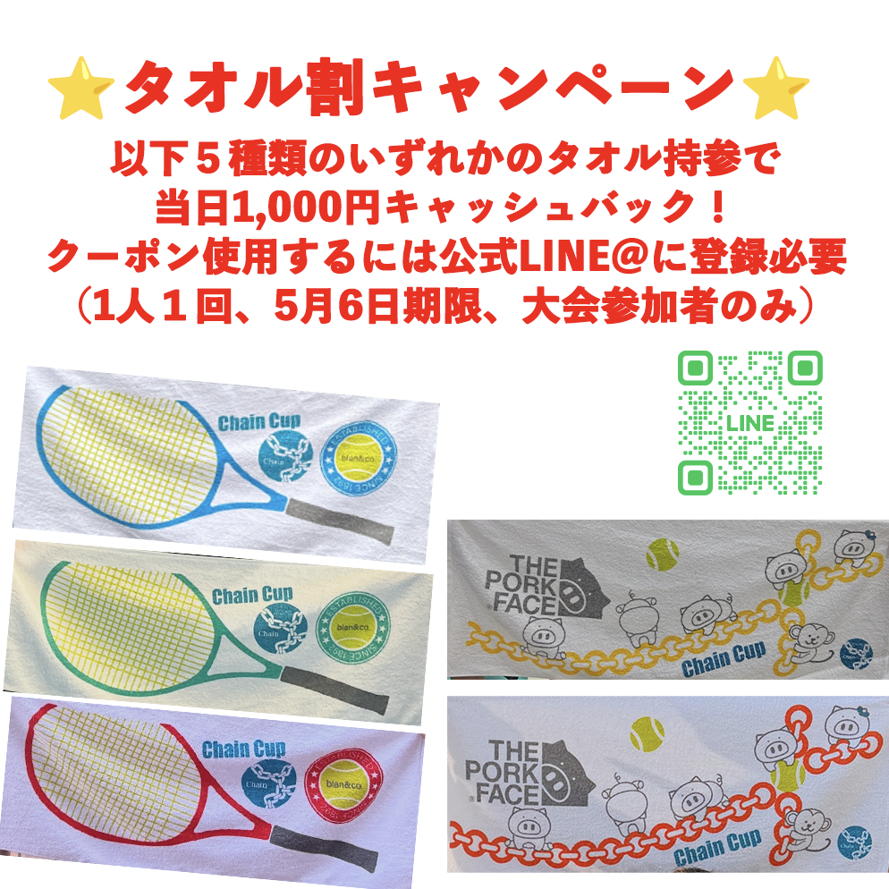 当日、「ChainCup」のロゴ入りタオル持参で1人500円割引(チームで最大3,000円)